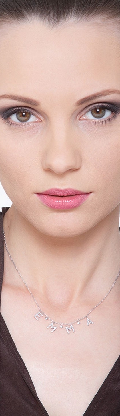Collana in oro bianco 18k, con la parola EMMA incastonata di diamanti taglio brillante colore G e Purezza Vs. Altezza lettere 7 mm. Le lettere sono intervallate da cipolline con diamante.