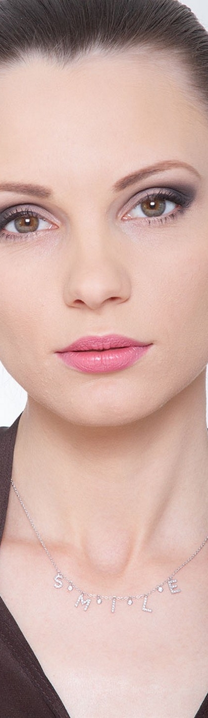 Collana in oro bianco 18k, con la parola SMILE incastonata di diamanti taglio brillante colore G e Purezza Vs. Altezza lettere 7 mm. Le lettere sono intervallate da cipolline con diamante.