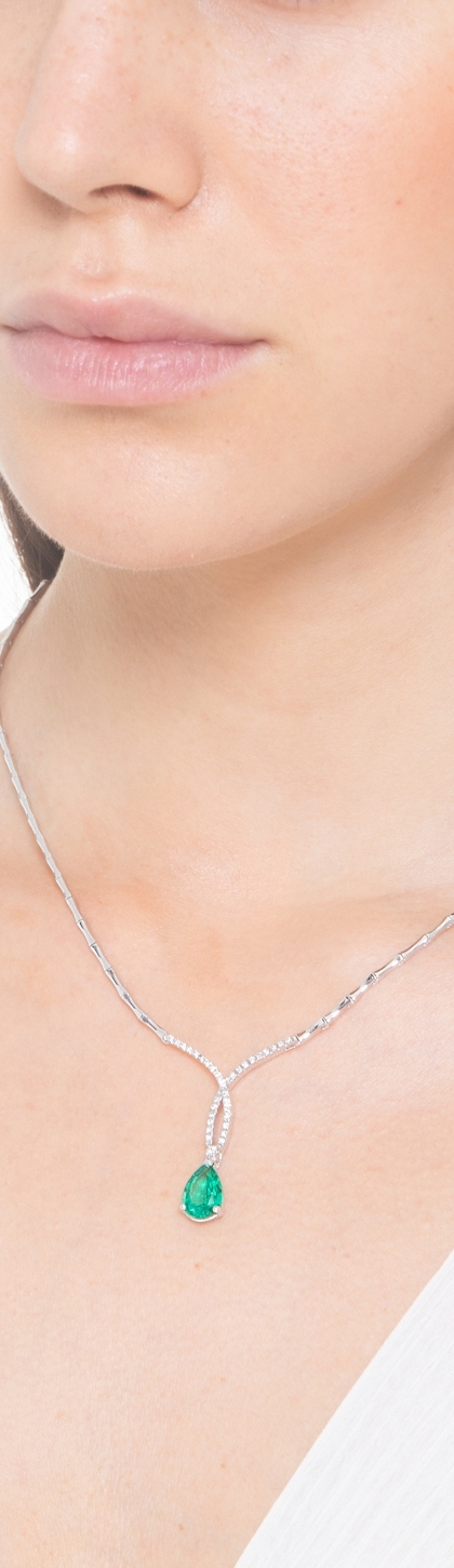 Collana semirigida in Oro Bianco 18k con smeraldo a goccia e diamanti.