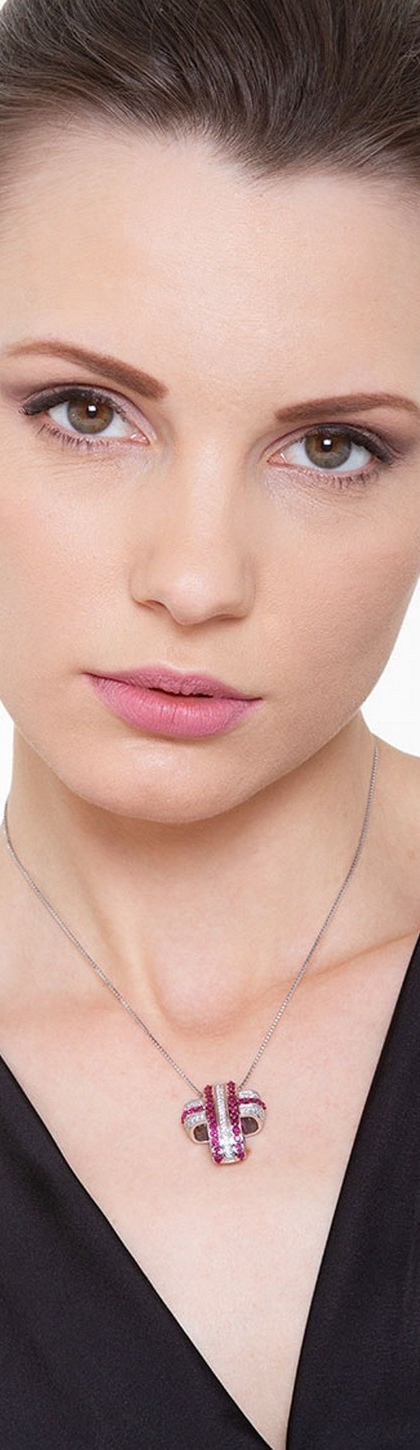 Collana con croce in oro bianco 18k con diamanti e rubini