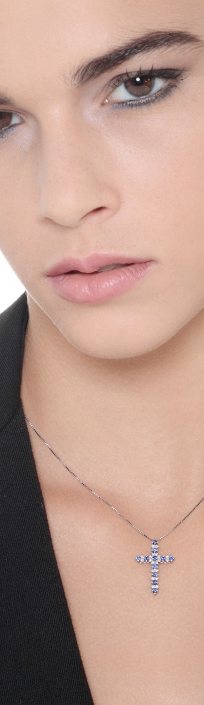 Collana con croce in oro bianco 18k con diamanti e zaffiri blu, 2.4x1.6 cm