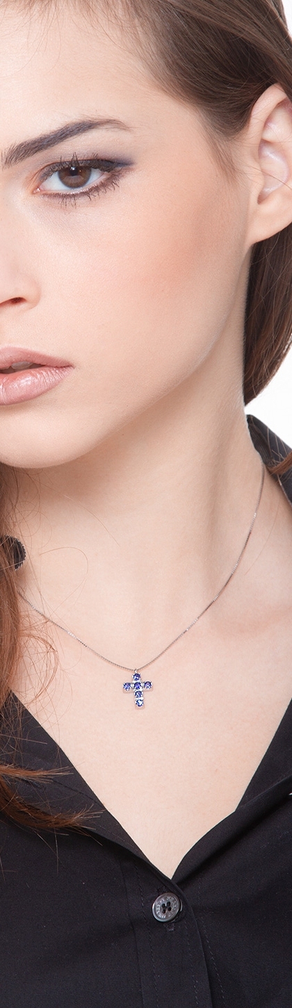 Collana con pendente a croce, di circa 1,45x1,1 cm, in oro bianco 18k con zaffiri blu
