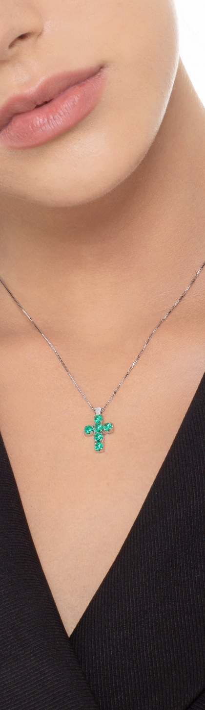 Collana con pendente a croce in oro bianco 18k con smeraldi