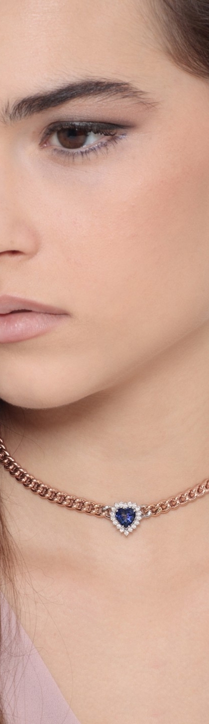 Collana groumette in oro rosa 18k con pendente a cuore in oro bianco 18k e diamanti e zaffiro blu