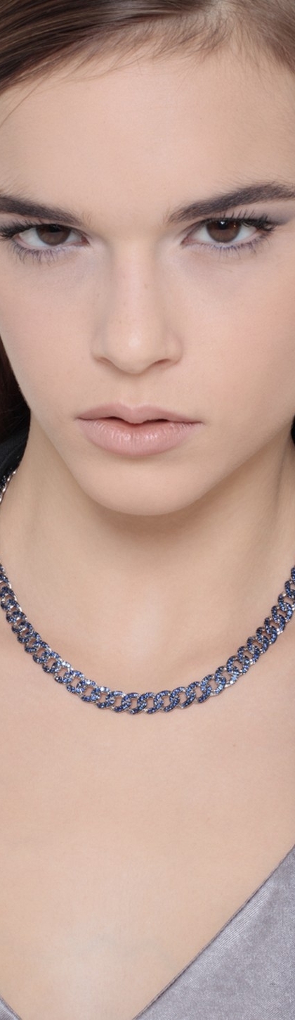 Collana morbida maglia groumette in Oro bianco 18k, con incastonati sulle maglie brunite Zaffiri Blu taglio brillante. La collana è composta da 66 maglie larghe 7 mm.