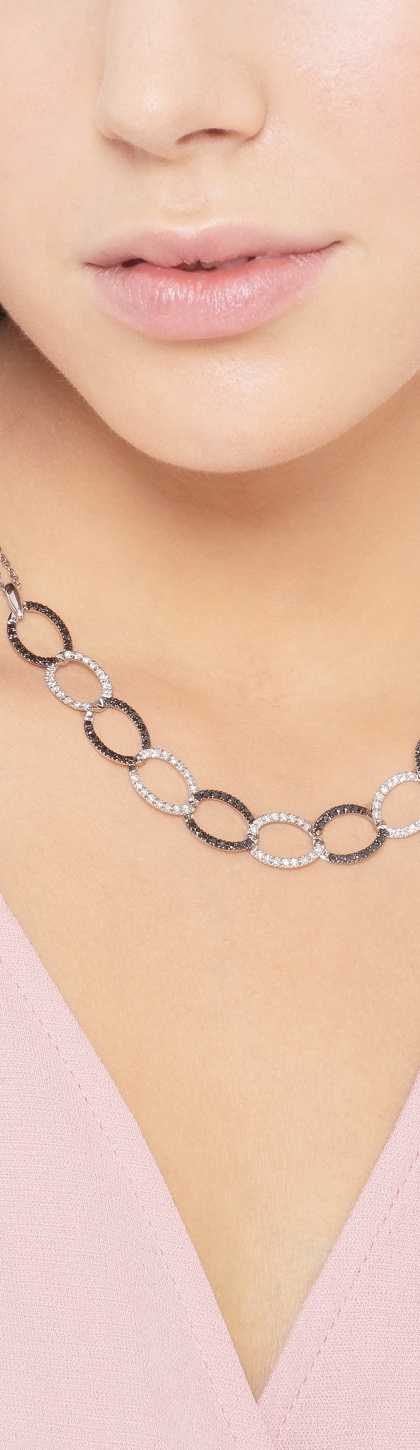 Girocollo a maglie ovali tipo groumette in oro bianco 18k con diamanti bianchi e neri