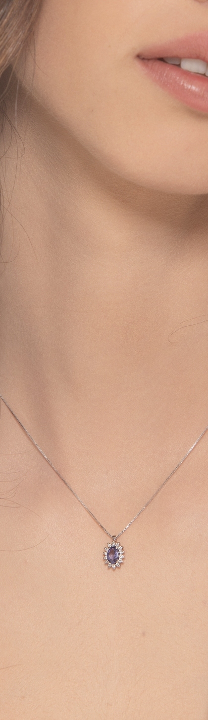 Collana con ciondolo in oro bianco 18k e tanzanite ovale di circa 6x4 mm. A contorno diamanti taglio brillante, colore G, purezza Vs.
