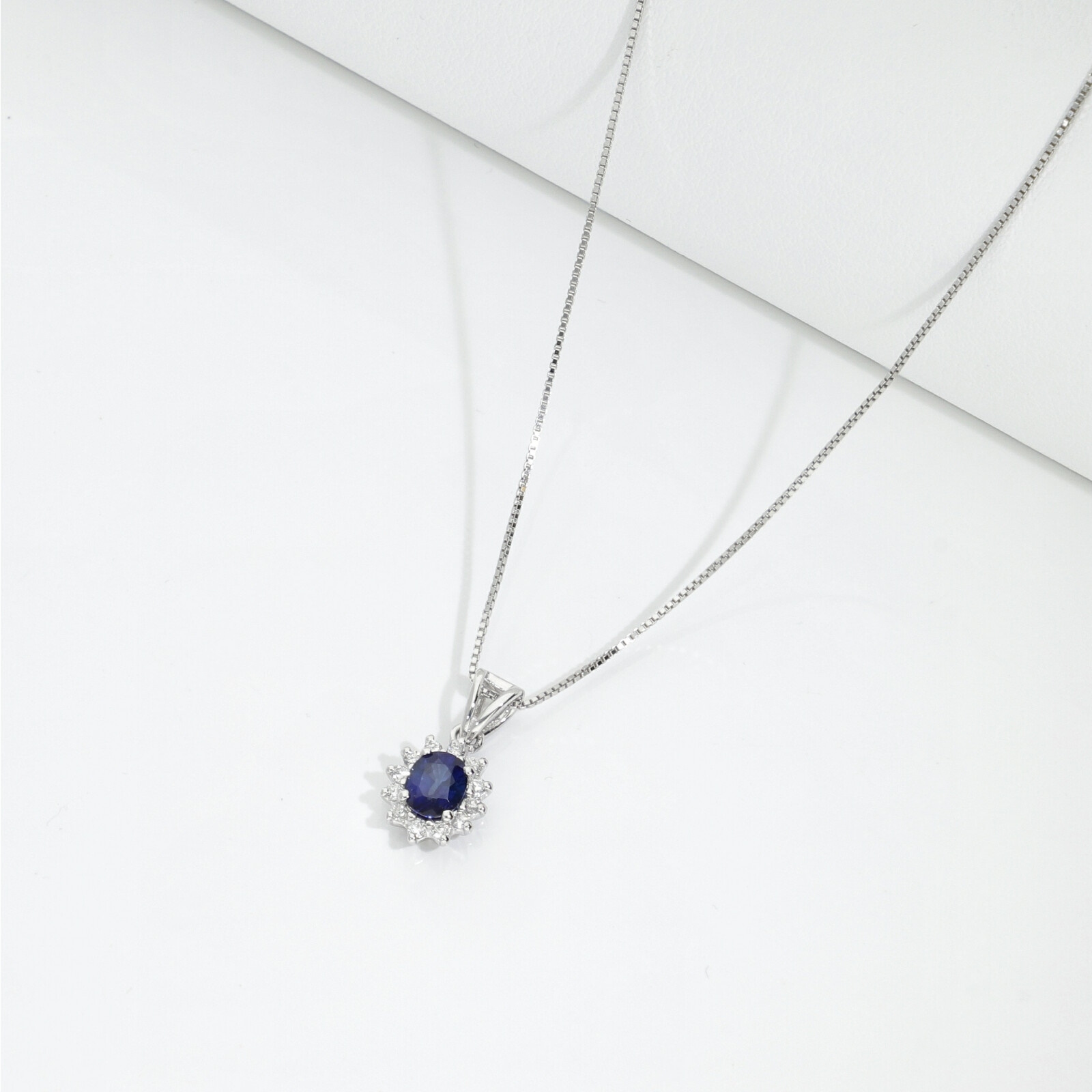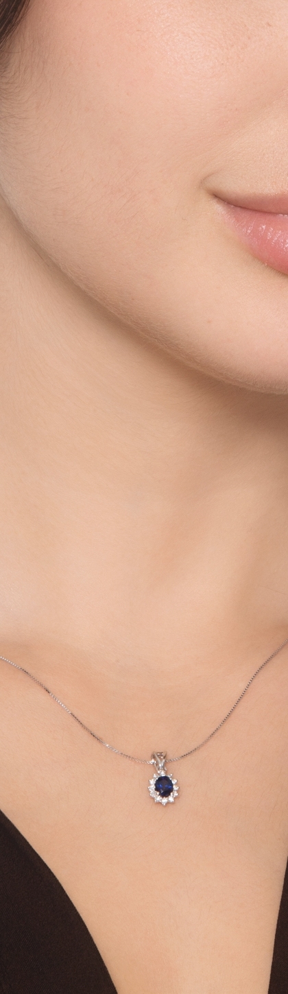 Collana contorno in oro bianco 18k con zaffiro blu ovale e diamanti