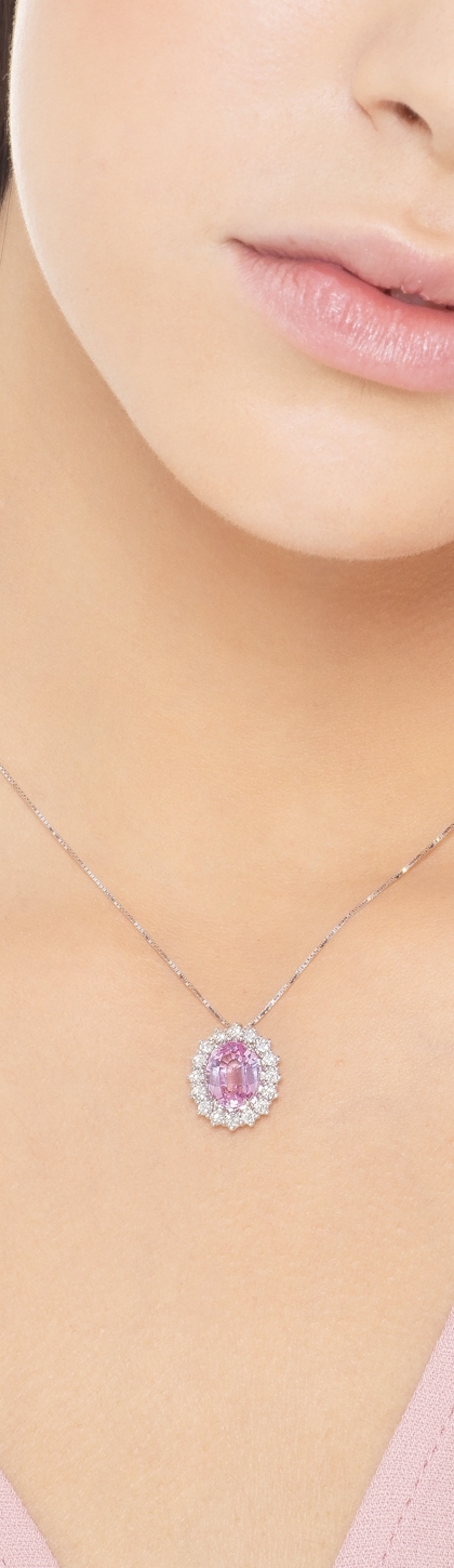 Collana e pendente in oro bianco 18k con zaffiro rosa ovale e diamanti