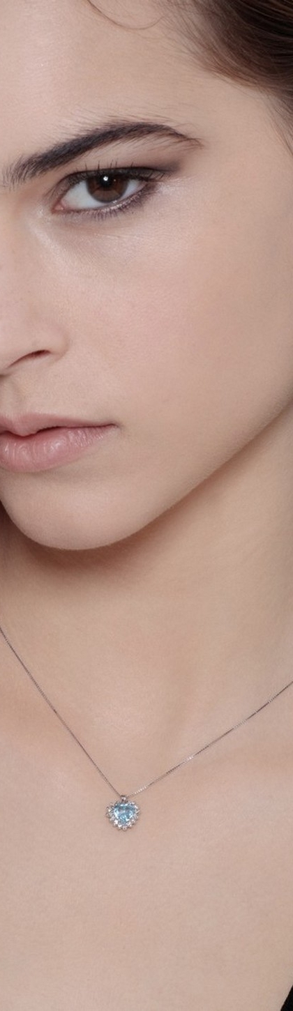 Collana in oro bianco 18k con acquamarina taglio a cuore contornata da diamanti taglio brillante colore G e purezza Vs.