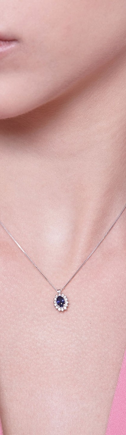 Collana in oro bianco 18k con Zaffiro blu taglio ovale contornato da Diamanti taglio brillante colore G e purezza Vs.