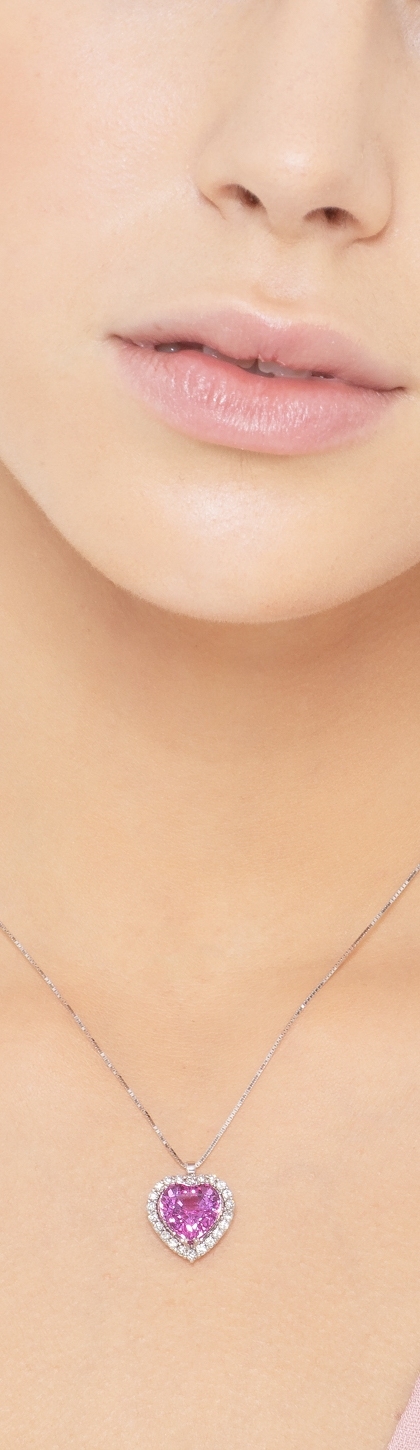 Collana in oro bianco 18k con ciondolo a cuore con zaffiro rosa e contorno in diamanti taglio brillante, colore G e purezza Vs. Il ciondolo misura 14.5x17 mm circa.