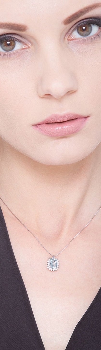 Collana in oro bianco 18k con contorno in diamanti e acquamarina al centro