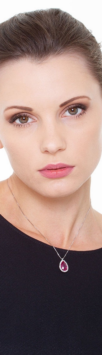 Collana in oro bianco 18k con contorno in diamanti e rubino a goccia centrale
