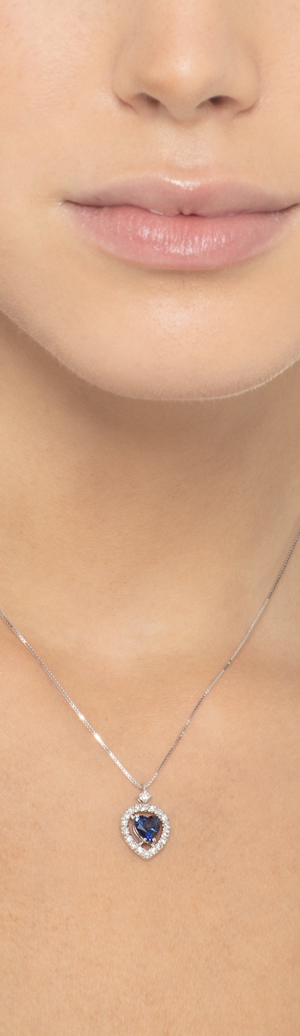 Collana in oro bianco 18k con pendente a cuore con zaffiro blu e diamanti