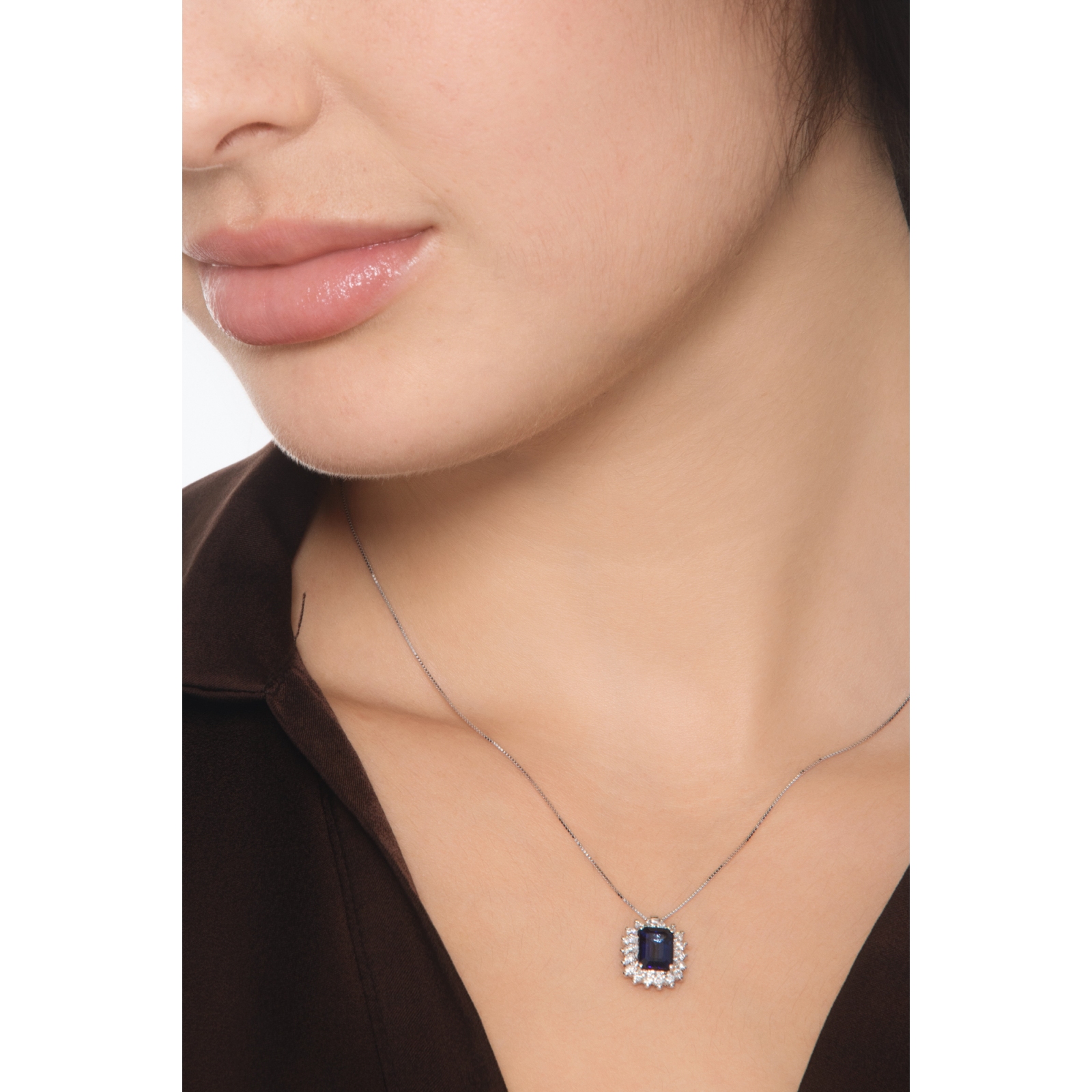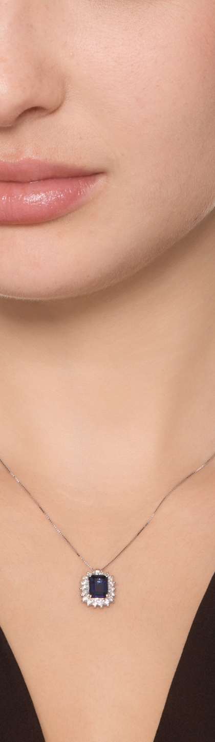 Collana in oro bianco 18k con pendente contorno in diamanti taglio brillante, colore G, purezza Vs e zaffiro blu centrale taglio rettangolare di circa 8x6 mm. Il ciondolo misura circa 13x11 mm.