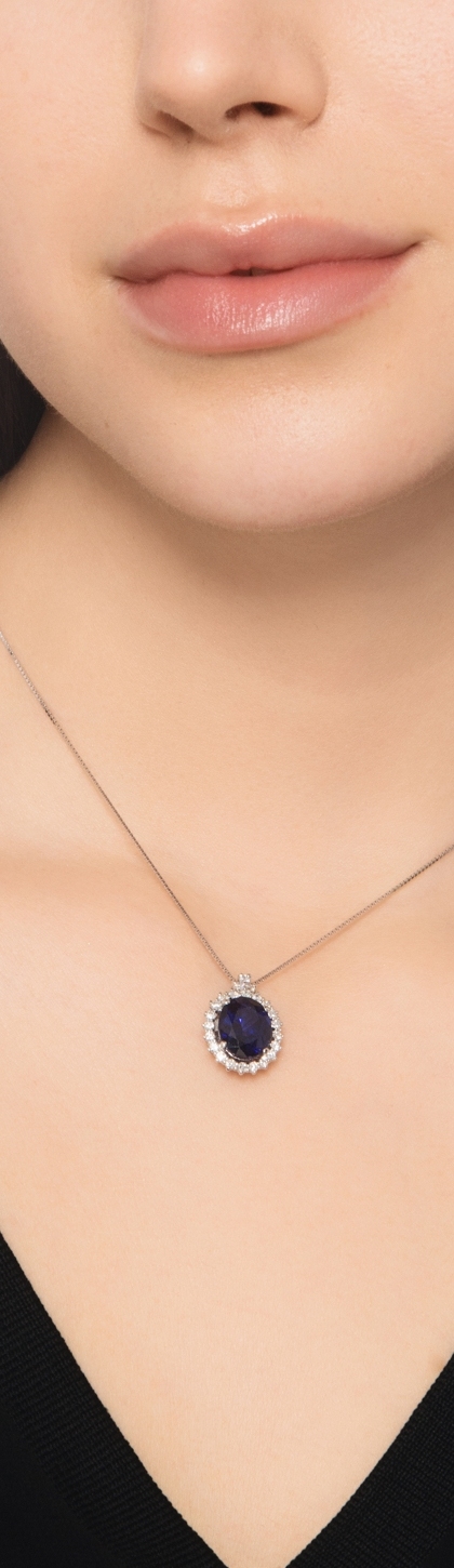 Collana in oro bianco 18k con pendente in zaffiro blu ovale e diamanti