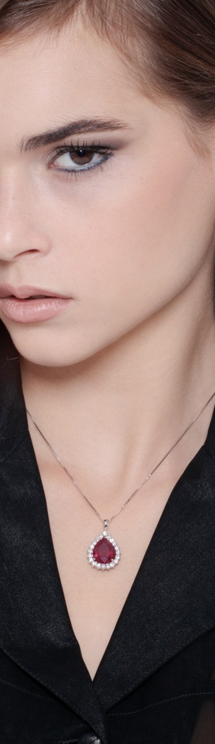 Collana in oro bianco 18k con rubino a goccia e contorno di diamanti