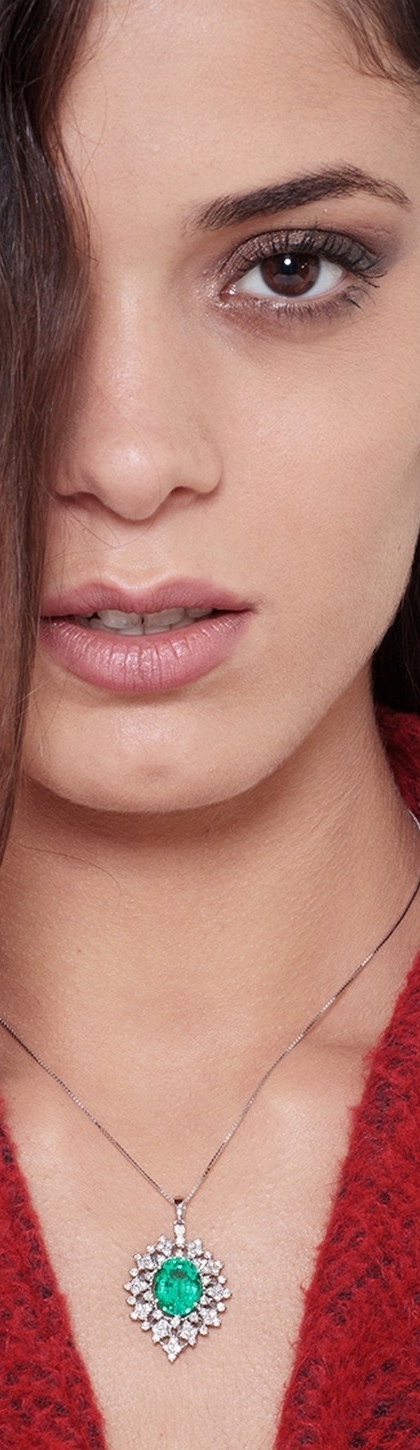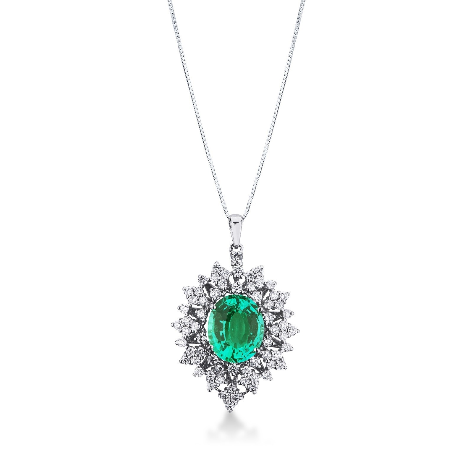 Collana in oro bianco 18k con incastonato nel pendente, smeraldo taglio ovale contornato da diamanti taglio brillante colore G e purezza Vs. Collana di grande prestigio con le sue linee classiche e la montatura a filo che dona luce alle pietre preziose.