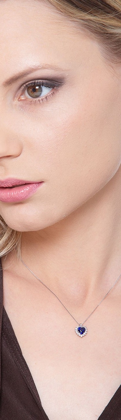 Collana in oro bianco 18k con zaffiro blu a cuore e diamanti
