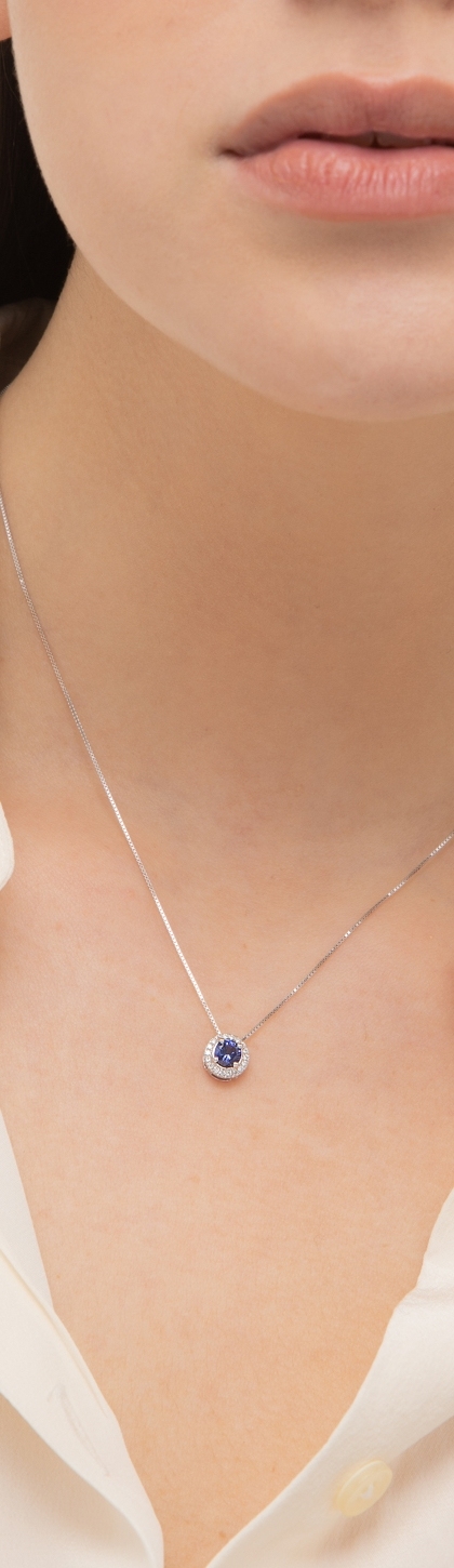 Collana in oro bianco 18k con zaffiro blu centrale e contorno in diamanti