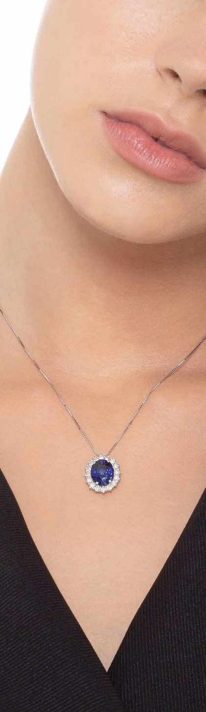 Collana in oro Bianco 18k con zaffiro blu taglio ovale e contorno in diamanti