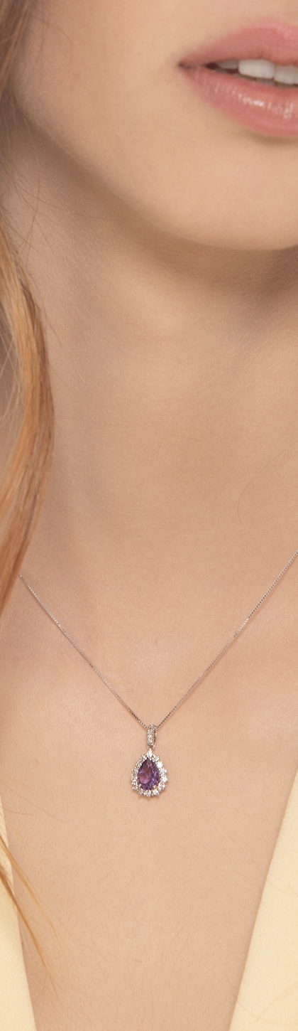 Collana in oro bianco 18k e ciondolo con ametista a goccia e diamanti anche sulla biglierina