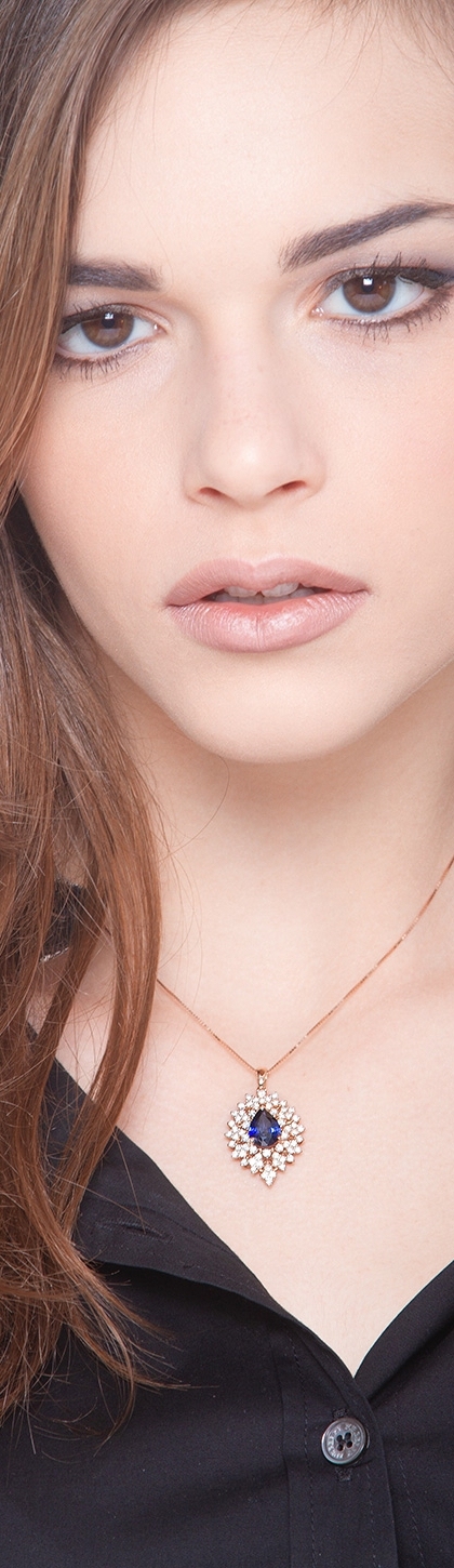 Collana in oro rosa 18k con zaffiro blu a goccia e diamanti