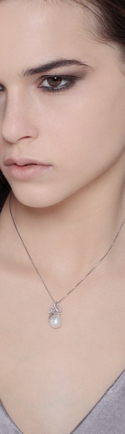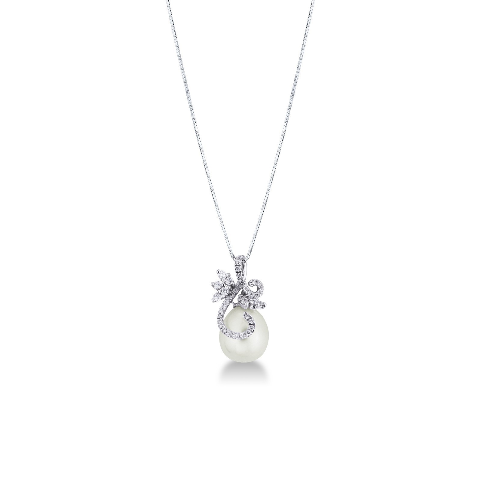 Collana con pendente intreccio in oro bianco 18k con diamanti e perla