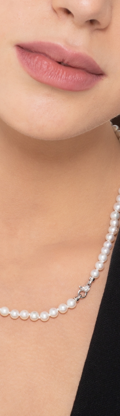 Collana di perle giapponesi di circa 5 mm con chiusura in oro bianco 18k e diamanti