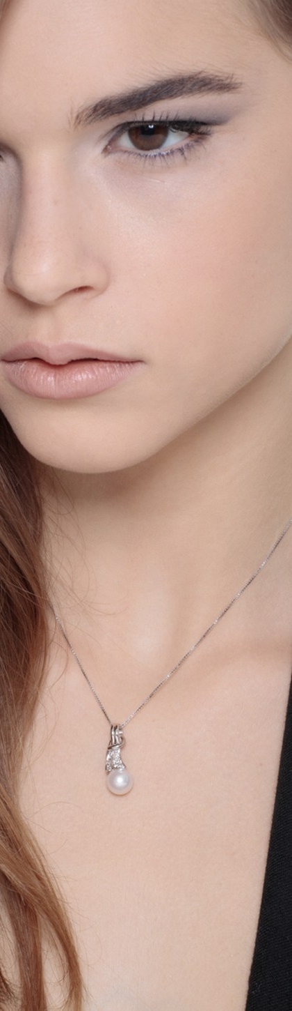 Collana in oro bianco 18k con diamanti a fiocco e perla naturale