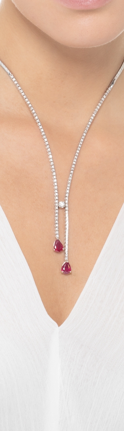Collana in oro bianco 18k tipo tennis con diamanti e 2 rubini a goccia di circa 10x7 mm alle estremità