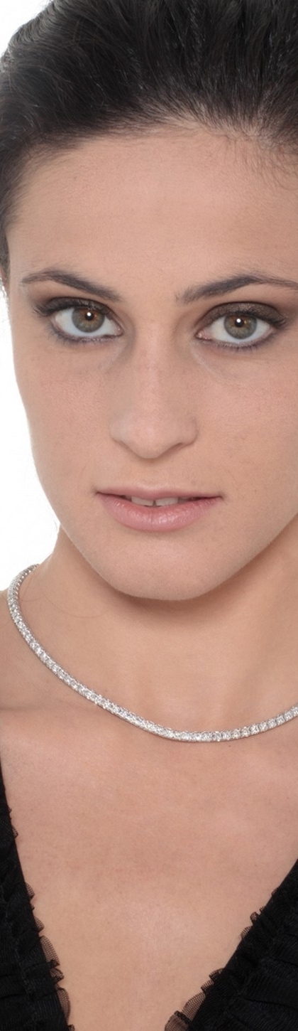 Collana tennis in oro bianco 18k, con incastonati diamanti taglio brillante, colore G e purezza Vs. Collana dalle linee morbide che si adatta perfettamente alla linea del collo, di pregiata fattura ed eleganza.