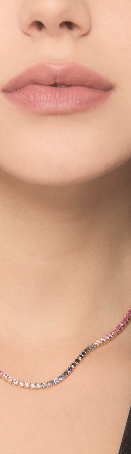 Questa collana con pietre colorate Rainbow unisce una vibrante espressione cromatica ad design essenziale. Gli zaffiri, disposte con meticolosa precisione lungo tutta la linea della collana tennis, creano un effetto arcobaleno continuo che cattura lo sguardo.La maglia in oro sottile e lineare, segue la forma del collo con naturalezza, offrendo eleganza e comfort in ogni occasione.