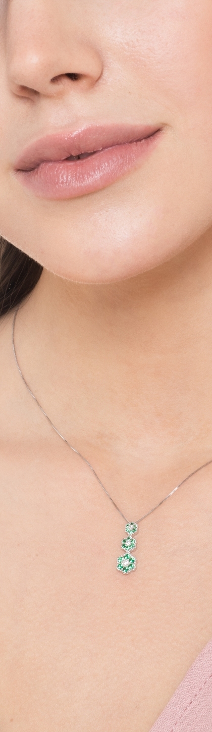 Collana in oro bianco 18k con pendente trilogy a fiore in diamanti taglio brillante, colore G, purezza Vs e smeraldi. Il pendente misura circa 1.90x0.70 cm.