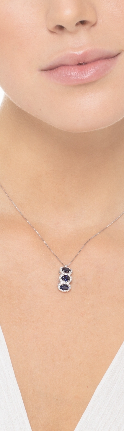 Collana in oro bianco 18k con 3 zaffiri blu ovali e diamanti