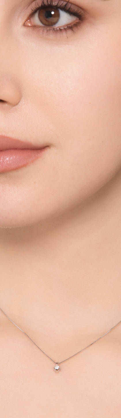 Collana punto luce a cipollina in oro bianco 18k, con incastonato al centro diamante taglio brillante colore G e purezza Vs.