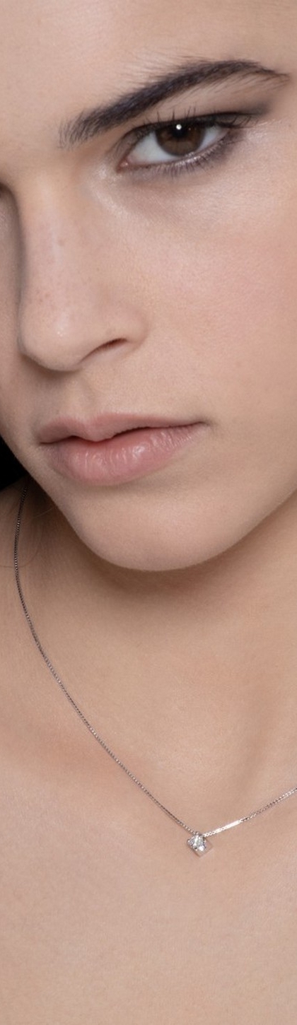Collana in oro bianco 18k montatura a castone con diamante taglio brillante colore G e purezza Vs.