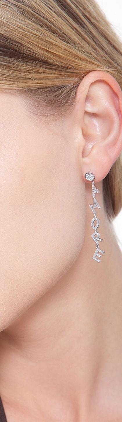 Mono orecchino pendente in oro bianco 18k con la parola AMORE incastonata in diamanti taglio brillante colore G e Purezza Vs. Altezza orecchino 54 mm.