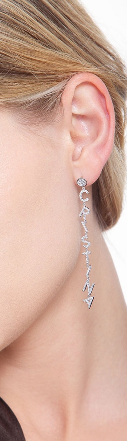 Mono orecchino pendente in oro bianco 18k, con la parola CRISTINA incastonata di diamanti taglio brillante colore G e Purezza Vs. Altezza orecchino 72 mm.