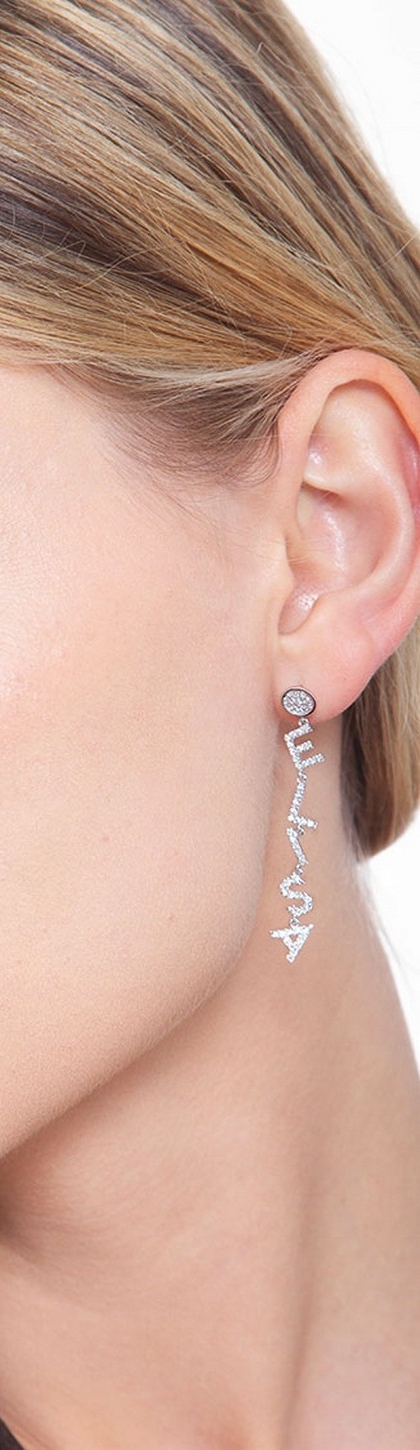 Mono orecchino pendente in oro bianco 18k, con la parola ELISA incastonata di diamanti taglio brillante colore G e Purezza Vs. Altezza orecchino 56 mm.