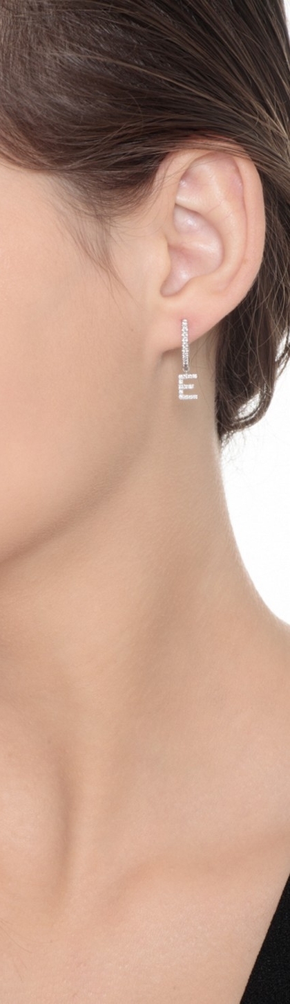 Mono orecchino in oro bianco 18k con lettera E incastonata in diamanti taglio brillante colore G e purezza Vs. Altezza lettera 7 mm.