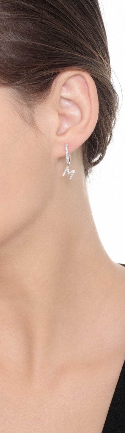 Mono orecchino in oro bianco 18k, con lettera M incastonata di diamanti taglio brillante colore G e purezza Vs. Altezza lettera 7 mm.