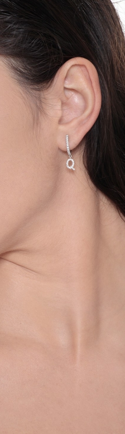 Mono Orecchino in oro bianco 18k, con lettera Q incastonata di diamanti taglio brillante colore G e purezza Vs. Altezza lettera 7 mm.