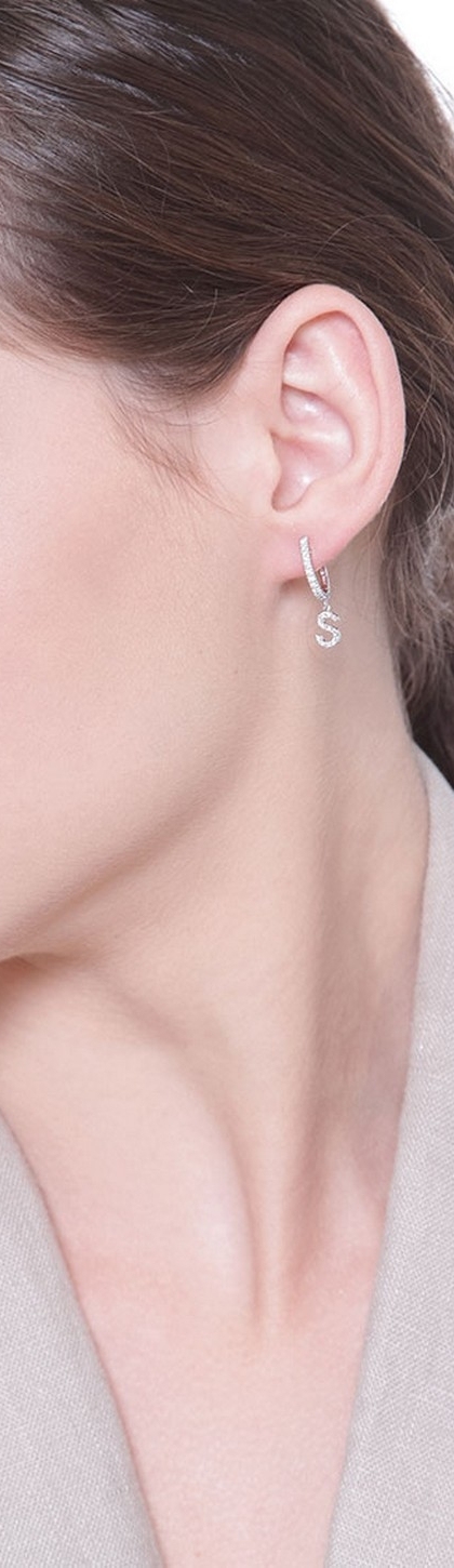 Mono Orecchino in oro bianco 18k, con lettera S incastonata di diamanti taglio brillante colore G e purezza Vs. Altezza lettera 7 mm.