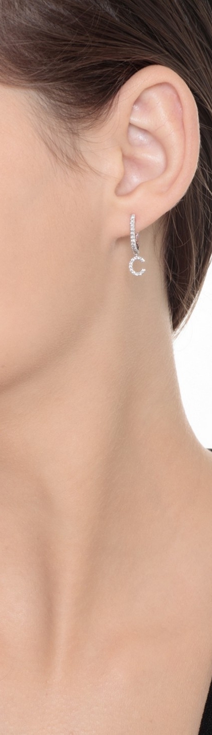 Mono orecchino in oro bianco 18k con lettera C incastonata di diamanti taglio brillante colore G e Purezza Vs. Altezza lettera 7 mm.