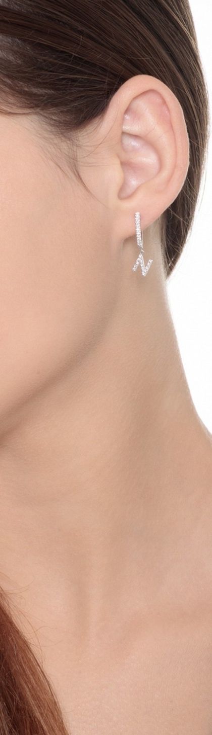 Mono orecchino in oro bianco 18k, con lettera N incastonata di diamanti taglio brillante colore G e purezza Vs. Altezza lettera 7 mm.