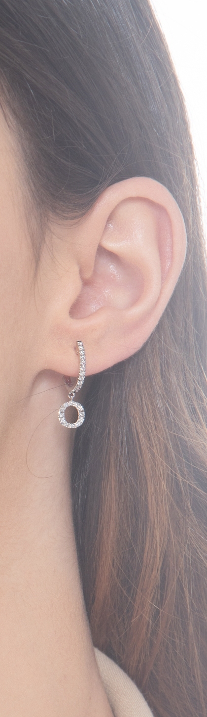 Mono orecchino in oro bianco 18k con pendente lettera O in diamanti taglio brillante. La lettera ha un diametro di 7 mm.