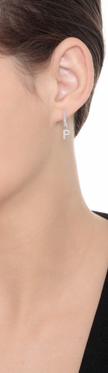Mono orecchino in oro bianco 18k con lettera P incastonata di diamanti taglio brillante colore G e purezza Vs. Altezza lettera 7 mm.