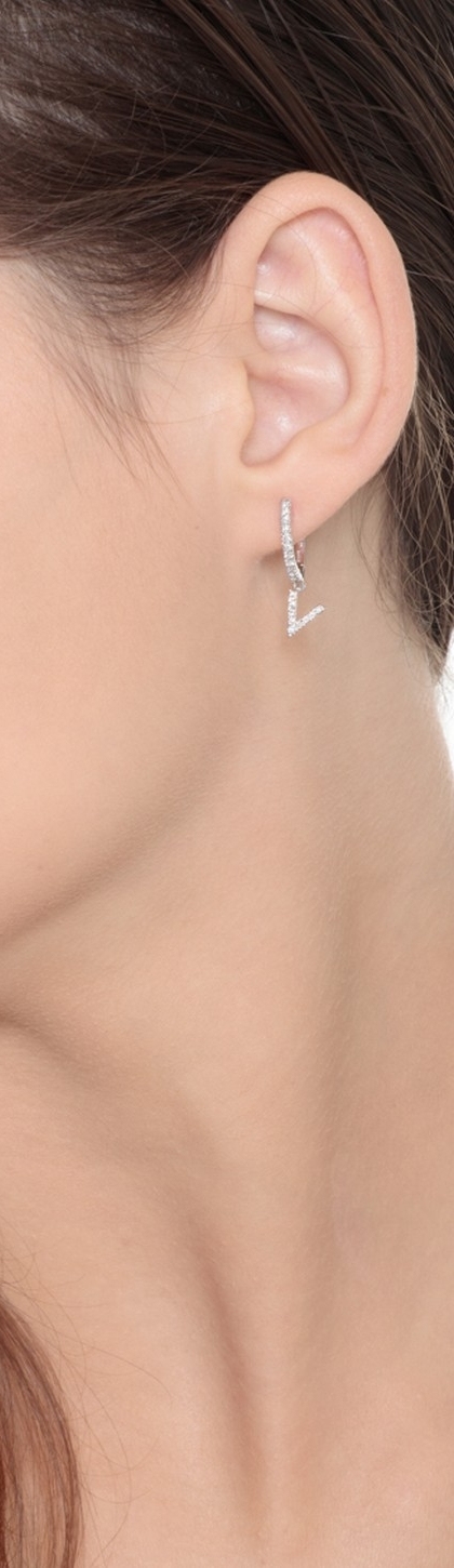 Mono orecchino in oro bianco 18k, con lettera V incastonata di diamanti taglio brillante colore G e purezza Vs. Altezza lettera 7 mm.